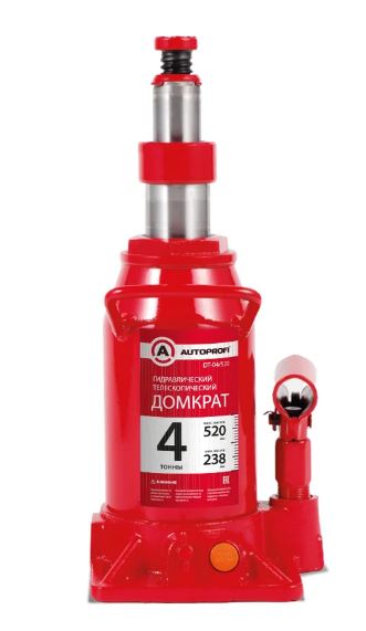 Главная / Домкраты, стаховочные опоры / Домкраты гидравлические бутылочные, телескопические / Домкрат бутылочный AUTOPROFI, гидравлический, телескопичееский, 4 тонны, защита от перегруза, высота