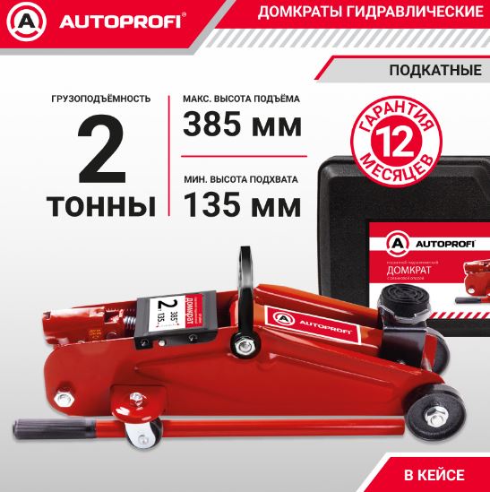 Главная / Домкраты, стаховочные опоры / Домкраты гидравлические подкатные / Домкрат подкатной AUTOPROFI, гидравлический, 2 тонны, высота подъёма 135 - 385 мм., резиновая опора,
