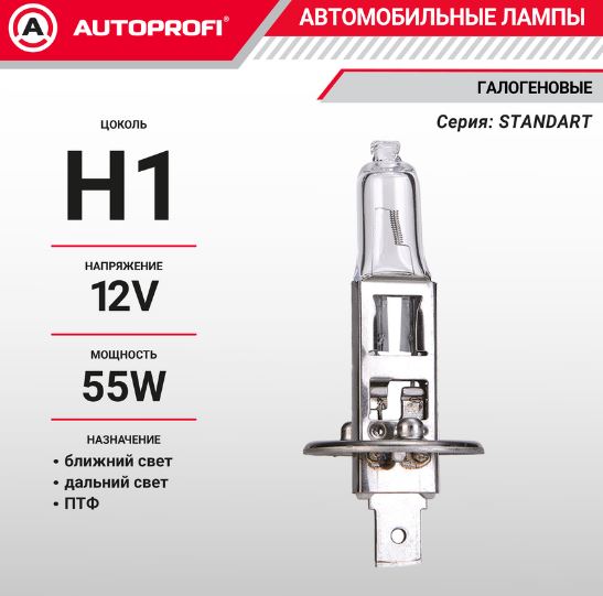 Главная / Автосвет / Автолампы AUTOPROFI / Лампа автомобильная галогенная H1, 12V, 55W, (P14,5S),1 шт, STANDARD