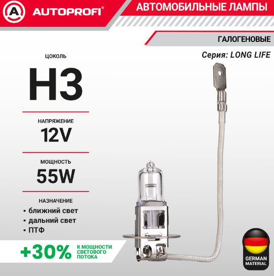 Главная / Автосвет / Автолампы AUTOPROFI / Лампа автомобильная галогенная H3, 12V, 55W, (PK22S),1 шт, +30% LONG LIFE