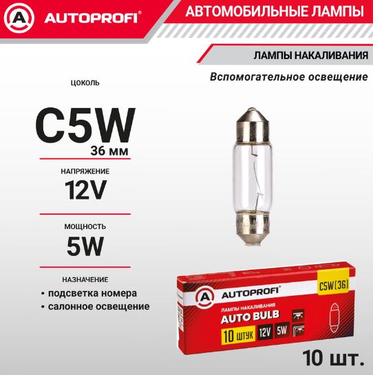 Главная / Автосвет / Автолампы AUTOPROFI / Лампа автомобильная накаливания C5W, 36 мм,12V, 5W, (SV8.5),10 шт.