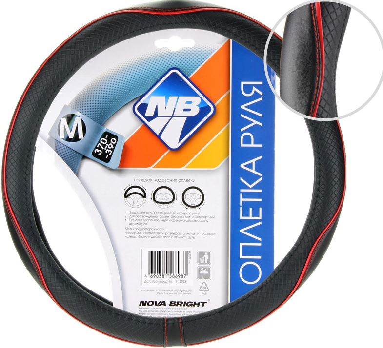 Оплетка на руль "Nova Bright" (М) экокожа, черная с фигурным тиснением и красной отделкой 48307