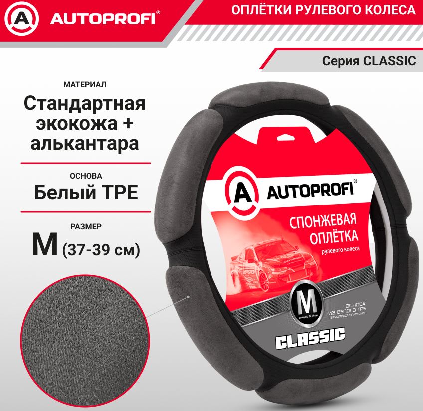 Главная / Оплетки на руль автомобиля / Оплетки AUTOPROFI / Оплётка руля, серия Classic, спонжевая, экокожа, "6 подушек" из алькантары, наполнитель 2 см. порол