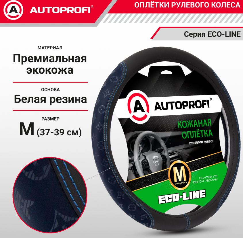 Главная / Оплетки на руль автомобиля / Оплетки AUTOPROFI / Оплётка руля, серия Eco-Line, премиальная экокожа, вставки с принтом в стиле Fashion Черный/т.синий,