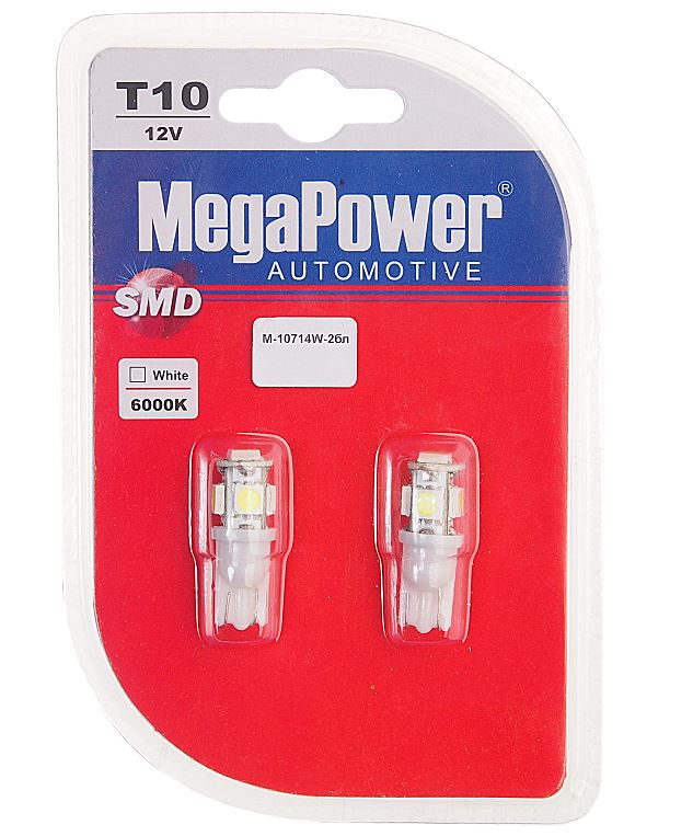 Главная / Автосвет / Автолампы светодиодные 12V / MEGAPOWER Led 12V / Автолампа светодиодная T10W (W2,1x9,5d) 5 SMD 5050 WHITE блистер (2 шт) 6000K 12V MEGAPOWER /1/50