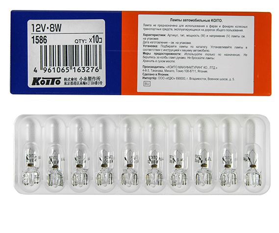 Главная / Автосвет / Автолампы KOITO п-во Япония / Автолампы KOITO 12V / Автолампа T10 без цоколя 12V 8W KOITO кратно 10шт. 1586