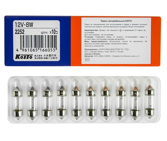 Главная / Автосвет / Автолампы KOITO п-во Япония / Автолампы KOITO 12V / Автолампа T10x31 12V 8W KOITO кратно 10шт. 2252