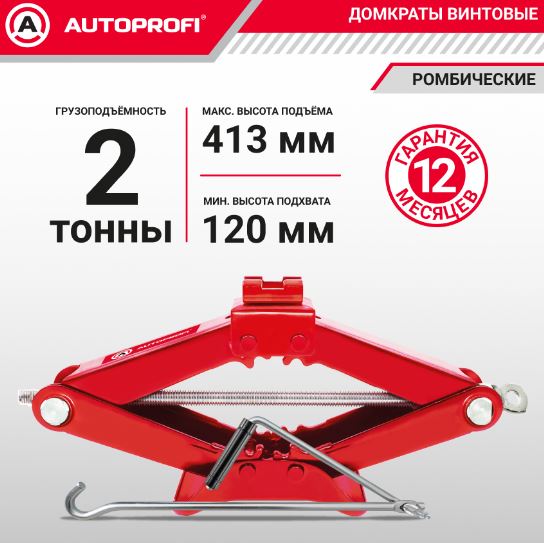 Главная / Домкраты, стаховочные опоры / Домкраты механические ромбические / Домкрат ромбический AUTOPROFI, механический, винтовой, 2 тонны, высота подъёма 120 - 413 мм.