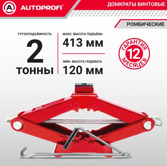 Главная / Домкраты, стаховочные опоры / Домкраты механические ромбические / Домкрат ромбический AUTOPROFI, механический, винтовой, 2 тонны, высота подъёма 120 - 413 мм., с рез