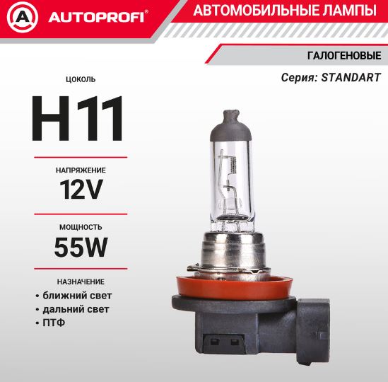 Главная / Автосвет / Автолампы AUTOPROFI / Лампа автомобильная галогенная H11, 12V, 55W, (PGJ19-2),1 шт, STANDARD
