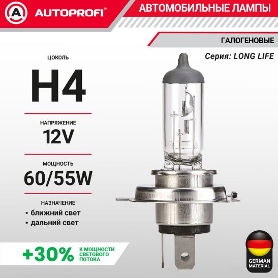 Главная / Автосвет / Автолампы AUTOPROFI / Лампа автомобильная галогенная H4, 12V, 60/55W, (P43T),1 шт, +30% LONG LIFE