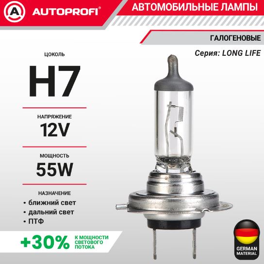 Главная / Автосвет / Автолампы AUTOPROFI / Лампа автомобильная галогенная H7, 12V, 55W, (PX26D),1 шт, +30% LONG LIFE