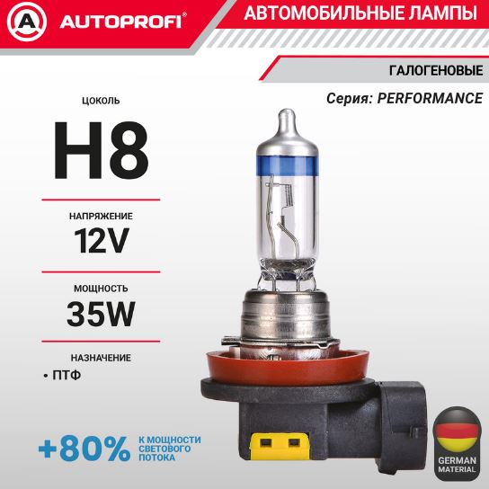 Главная / Автосвет / Автолампы AUTOPROFI / Лампа автомобильная галогенная H8, 12V, 35W, (PGJ19-1),1 шт, +80% PERFORMANCE