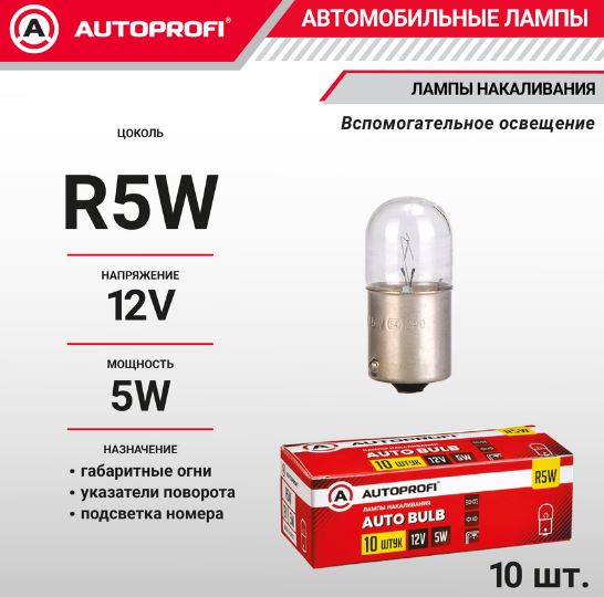 Главная / Автосвет / Автолампы AUTOPROFI / Лампа автомобильная накаливания R5W, 12V, 5W, (BA15s),10 шт.