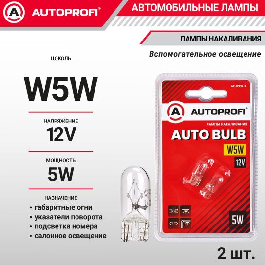 Главная / Автосвет / Автолампы AUTOPROFI / Лампы автомобильные накаливания W5W, 12V, 5W, (W2.1×9.5d), 2 шт. блистер