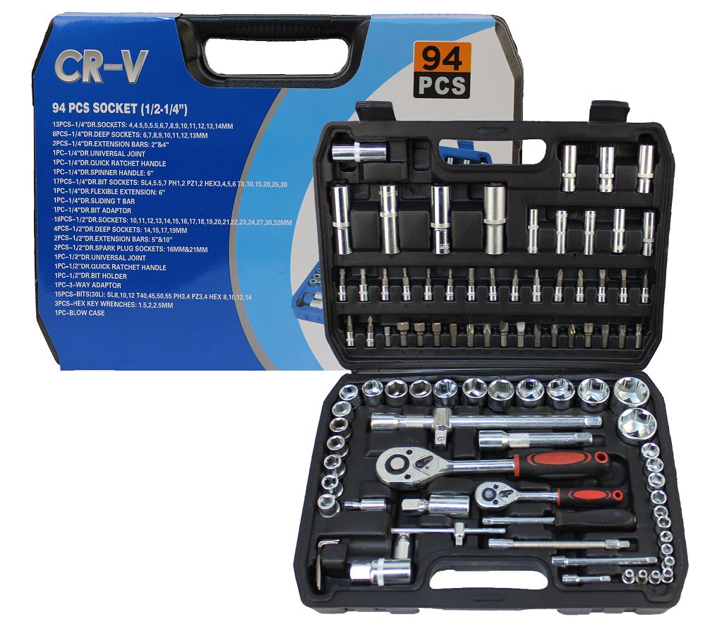 Главная / Инструмент / Наборы инструмента / Набор инструмента 94 предм. CR-V 6гран. 1/4, 1/2"DR, 1/5_