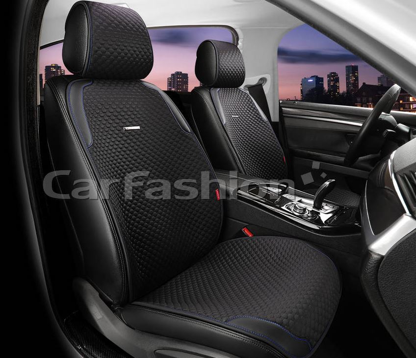 Главная / Чехлы и накидки на сиденья / Накидки на сиденья PREMIUM / Накидки Фронт 2D «SLEEK FRONT» черный/черный/синий Материал: полиэстер/экокожа