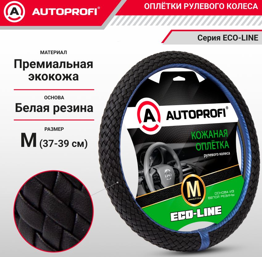 Главная / Оплетки на руль автомобиля / Оплетки AUTOPROFI / Оплётка руля, серия Eco-Line, премиальная экокожа, полностью плетёная чёрн./синий, разм. М,