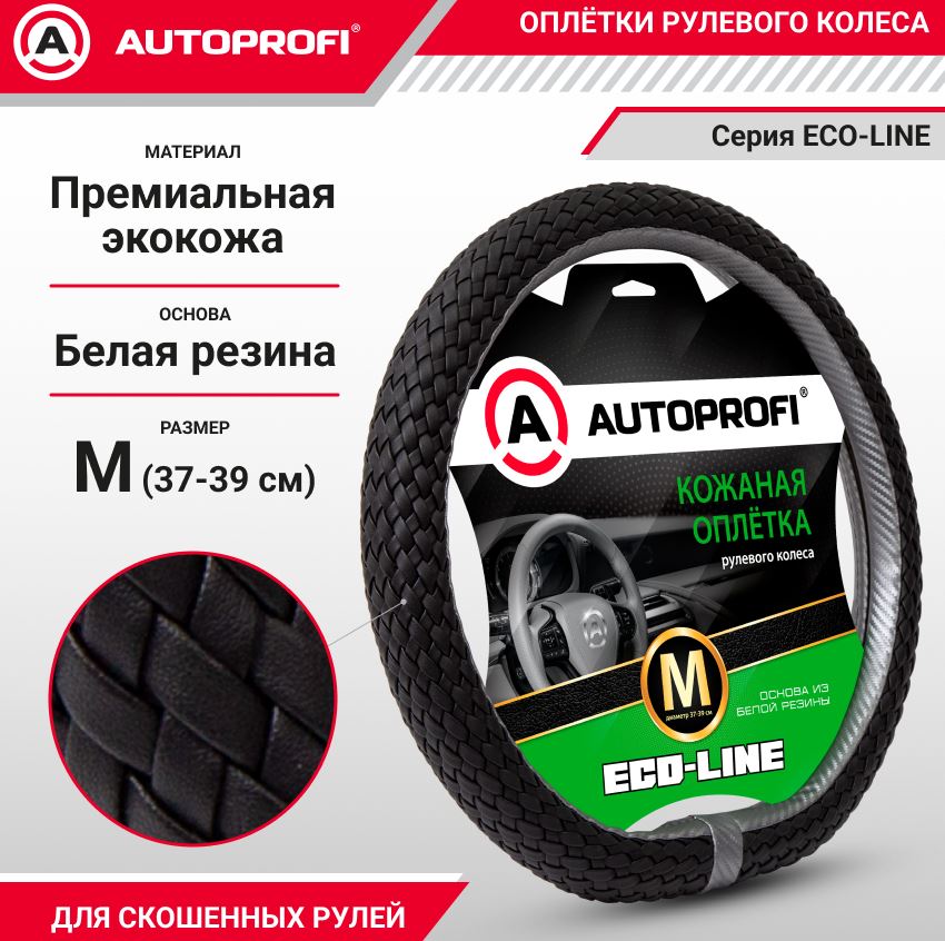 Главная / Оплетки на руль автомобиля / Оплетки AUTOPROFI / Оплётка руля со скосом, серия Eco-Line, премиальная экокожа, полностью плетёная чёрн./т.серый, разм.