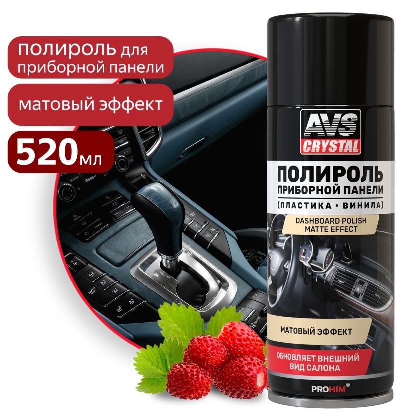 Главная / Автохимия и автокосметика / Полироли салона / Полироль для приборной панели "Земляника" (аэрозоль) матовый 520 мл. AVS AVK-849 /1/12/