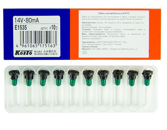 Главная / Автосвет / Автолампы KOITO п-во Япония / Автолампы KOITO 12V / Автолампа T4.2 - пластик. цоколь 14V 80mA (зелёный) KOITO кратно 10шт.