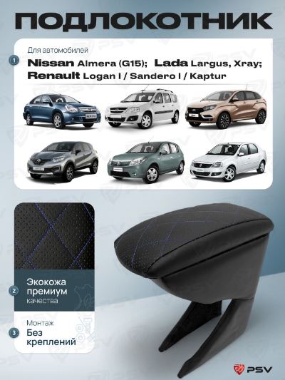 Главная / Автоаксессуары / Подлокотники / Автоподлокотник Nissan Almera (G15); Renault Logan I/Sandero I/Kaptur; Lada Largus, Xray - РОМБ/отст