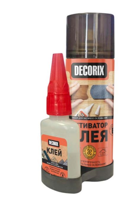 Профессиональный высококачественный двухкомпонентный клей DECORIX® – это набор из быстро полимеризующегося супер-клея (Компонент А) и аэрозольного активатора (Компонент Б). Клей обеспечивает высокую прочность склеивания и быстрое высыхание клеящего слоя. Не стекает с вертикальных поверхностей, идеально подходит для склеивания материалов в различных сочетаниях: древесины, МДФ, ДВП, кожи, резины, камня, большинства пластмасс, металла, керамики и т. п.