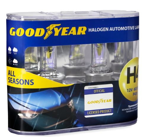Главная / Автосвет / Автолампы GOODYEAR / Лампа автомобильная галогенная Goodyear Н4 12V 60/55W P43t All seasons (бокс: к-т 2шт)