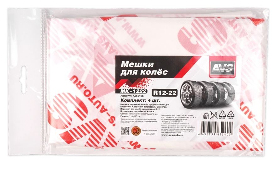 Главная / Товары для колес, шиномонтажа / Мешки, пакеты, чехлы для хранения колёс / Мешки для колёс R22 AVS MK-1222, 4 шт в пакете, 17 мкм 115х115 см, шт /1/30/