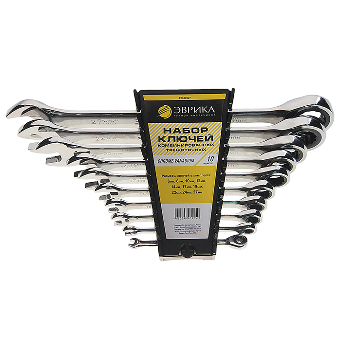 Главная / Инструмент / Наборы ключей / Набор ключей комб. трещоточных 10 пр. 6,8,10,12,14,17,19,22,24,27мм (на держателе) ЭВРИКА ER-20627