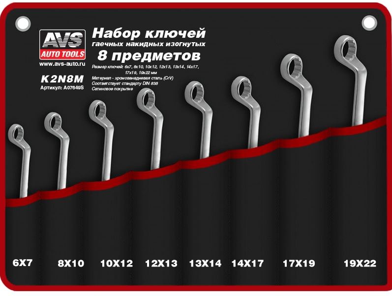 Главная / Инструмент / Наборы ключей / Набор ключей накидных 8 пр. 6-22 мм изогнутых в сумке AVS K2N8M