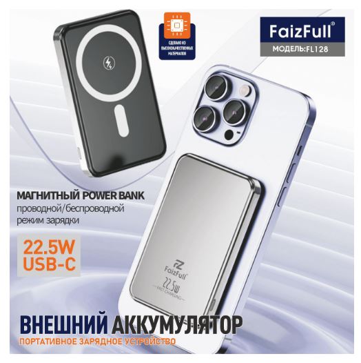 Главная / Электроника / Внешние аккумуляторы / Внешний аккумулятор (Power Bank) FaizFull FL128 10,000mAh USB-C 22,5W (беспроводной MagSafe) Black T