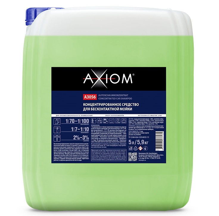 Концентрированное средство для бесконтактной мойки AXIOM® A3056 обладает хорошей пенообразующей и смачивающей способностями. Легко смывается, не оставляя разводы и придаёт лакокрасочной поверхности ярко выраженный блеск. Содержит антикоррозионные добавки. Эффективно работает в широком диапазоне жёсткости воды.