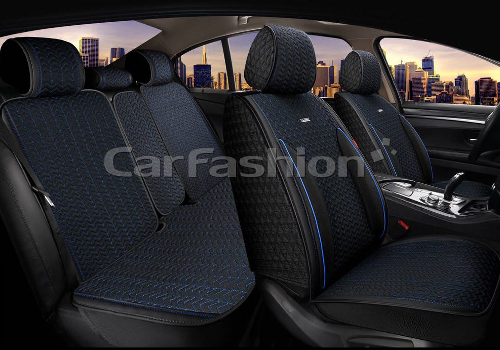 Главная / Чехлы и накидки на сиденья / Накидки на сиденья PREMIUM / Комплект Накидок «SHEVRON TWEED PLUS» черный/черный/синий/синий