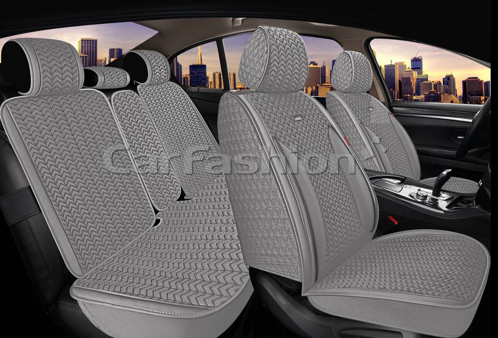 Главная / Чехлы и накидки на сиденья / Накидки на сиденья PREMIUM / Комплект Накидок «SHEVRON TWEED PLUS» серый/серый/т.серый/т.серый