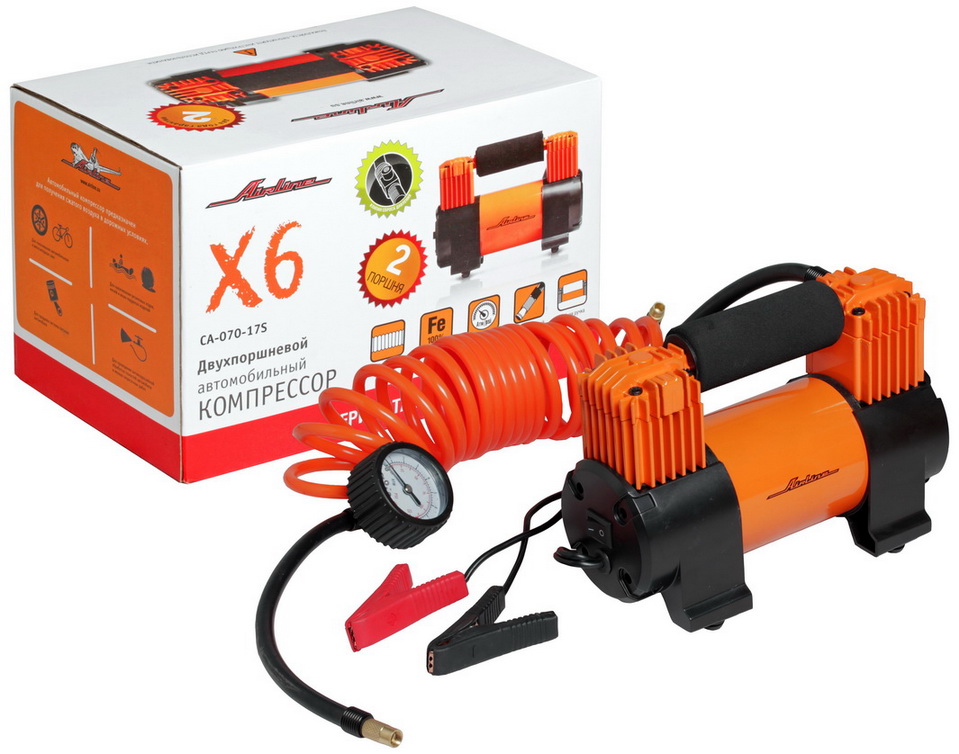 Главная / Компрессоры автомобильные. Насосы ножные, ручные / Компрессоры автомобильные / Компрессор 70 л/мин двухпоршневой AIRLINE X6 10 АТМ. от АКБ. серия STANDARD