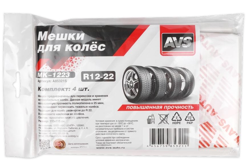 Главная / Товары для колес, шиномонтажа / Мешки, пакеты, чехлы для хранения колёс / Мешки для колес R22 AVS MK-1223 повыш.прочн., 4 шт в пакете, 25 мкм 115х115 см, шт /1/30/