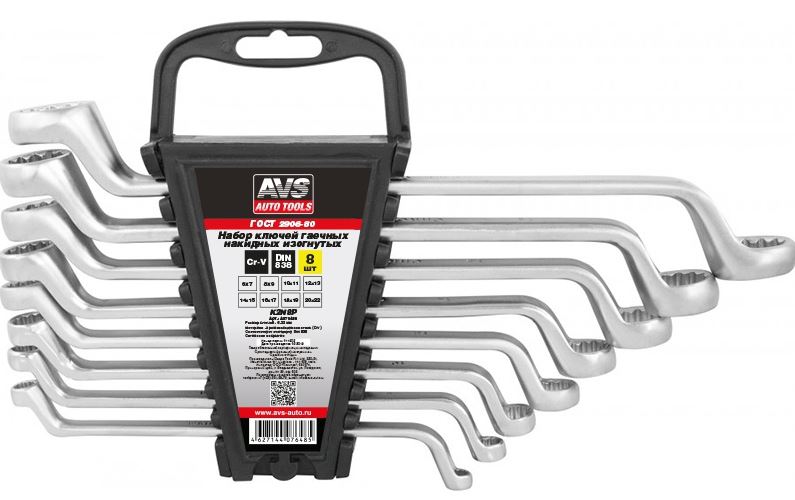 Главная / Инструмент / Наборы ключей / Набор ключей накидных 8 пр. 6-22 мм изогнутых на держателе AVS K2N8P