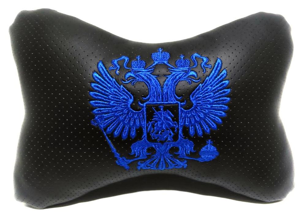 Главная / Чехлы и накидки на сиденья / Подушки ортопедические и декоративные / Подушка автомобильная на подголовник, косточка, ГЕРБ синяя вышивка ортопедическая. эко-кожа, в уп.