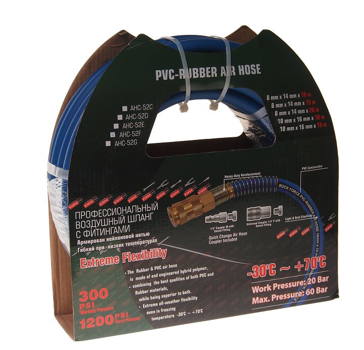 Главная / Инструмент / Пневмо инструмент / Шланг воздушный RF-AHC-52F ПВХ армированный с фитингами 10*16мм*10м (раб.давл.20bar,max60bar,-30C°+7